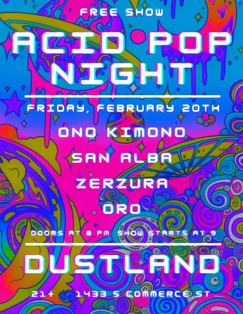 Back to All Events Acid Pop Night Friday, February 20, 2026 8:00 PM 11:59 PM The Dustland 1433 South Commerce Street Las Vegas, NV, 89102 United States (map) Google Calendar ICS Doors at 8p | Free Show A colorful, psychedelic pop night featuring Ono Kimono, San Alba, Oro, and Zerzura. Dreamy sounds, shimmering grooves, and an intimate three-hour live experience at DustlandFeaturing Ono Kimono | San Alba | Zerzura | Oro21+